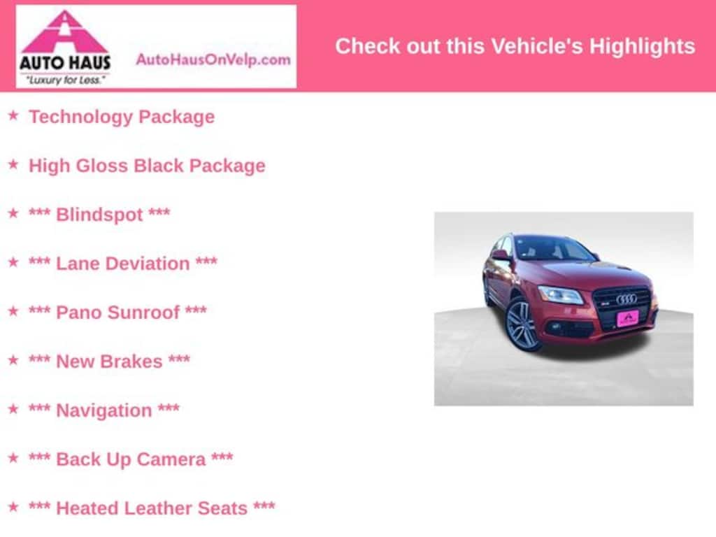 SQ5 *** Blindspot *** Lane Deviation *** Pano Sunroof *** New Brakes *** Navigation *** Back Up Camera *** Heated Leather Seats *** Bluetooth *** Inspected & Serviced by Master Technicians *** Recent Oil Change *** Vehicle Detailed *** Priced Below CARFAX and KBB Fair Market Price *** Nationwide Extended Warranties with Maintenance Available *** Rated #1 Dealership in Wisconsin 2022 2023 2024 by Dealer Rater *** Check out our Reviews! *** Audi Connect w/Online Services, Audi Parking System Plus w/Rear View Camera, Audi Side Assist, Exterior Mirror in Body Color, HDD Navigation w/Voice Control, High Gloss Black Package, Matte Black Roof Rails w/Cross Bars, MMI High Control Panel, Radio: Audi MMI Navigation Plus System, Technology Package.