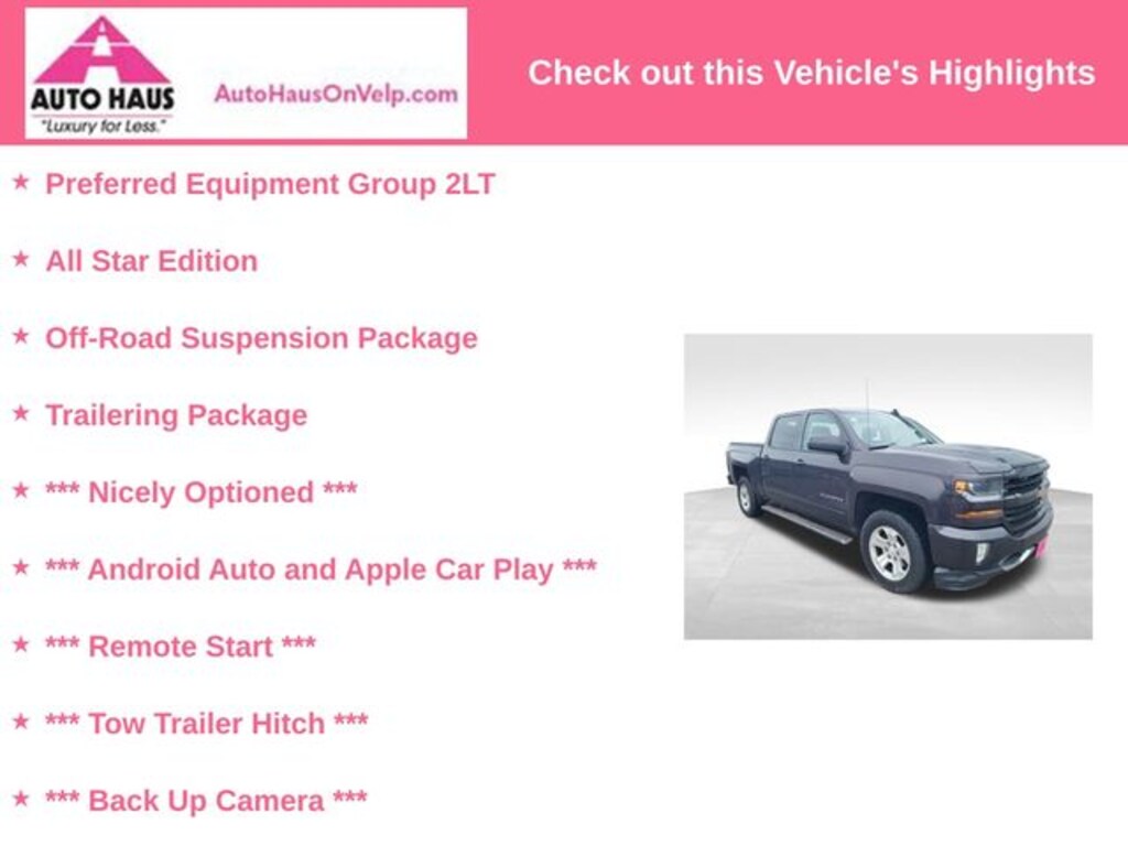 Coming Soon! Z-71 * Off-Road Suspension *** Preferred 2LT *** Trailering Package *** Nicely Optioned *** Android Auto and Apple Car Play *** Remote Start *** Tow Trailer Hitch *** Back Up Camera *** Heated Seats *** Bluetooth *** USB *** Inspected & Serviced by Master Technicians *** Recent Oil Change *** Vehicle Detailed *** Priced Below CARFAX and KBB Fair Market Price *** Nationwide Extended Warranties with Maintenance Available *** Rated #1 Dealership in Wisconsin 2022 2023 2024 by Dealer Rater *** Check out our Reviews! *** 6-Speed Automatic Electronic with Overdrive, 4WD, Black Cloth, 110-Volt AC Power Outlet, 150 Amp Alternator, 4.2" Diagonal Color Display Driver Info Center, 6 Speaker Audio System, All Star Edition, Bluetooth® For Phone, Body Color Bodyside Moldings, Body Color Door Handles, Body Color Rear Bumper w/Cornersteps, Body-Color Grille Surround, Body-Color Headlamp Bezels, Body-Color Mirror Caps, Body-Color Power Adjustable Heated Outside Mirrors, Color-Keyed Carpeting w/Rubberized Vinyl Floor Mats, Deep-Tinted Glass, Driver & Front Passenger Illuminated Vanity Mirrors, Dual-Zone Automatic Climate Control, Electric Rear-Window Defogger, EZ Lift & Lower Tailgate, Front Body-Color Bumper, Front Chrome Bumper, Front Frame-Mounted Black Recovery Hooks, HD Radio, Heavy-Duty Rear Locking Differential, Hill Descent Control, Leather Wrapped Steering Wheel w/Cruise Controls, Manual Tilt Wheel Steering Column, Off-Road Suspension Package, OnStar 6 Months Guidance Plan, OnStar w/4G LTE, Power Windows w/Driver Express Up, Preferred Equipment Group 2LT, Rear 60/40 Folding Bench Seat (Folds Up), Rear Chrome Bumper, Rear Vision Camera w/Dynamic Guide Lines, Rear Wheelhouse Liners, Remote Keyless Entry, Remote Locking Tailgate, Remote Vehicle Starter System, Single Slot CD/MP3 Player, Steering Wheel Audio Controls, Thin Profile LED Fog Lamps, Trailering Package.
