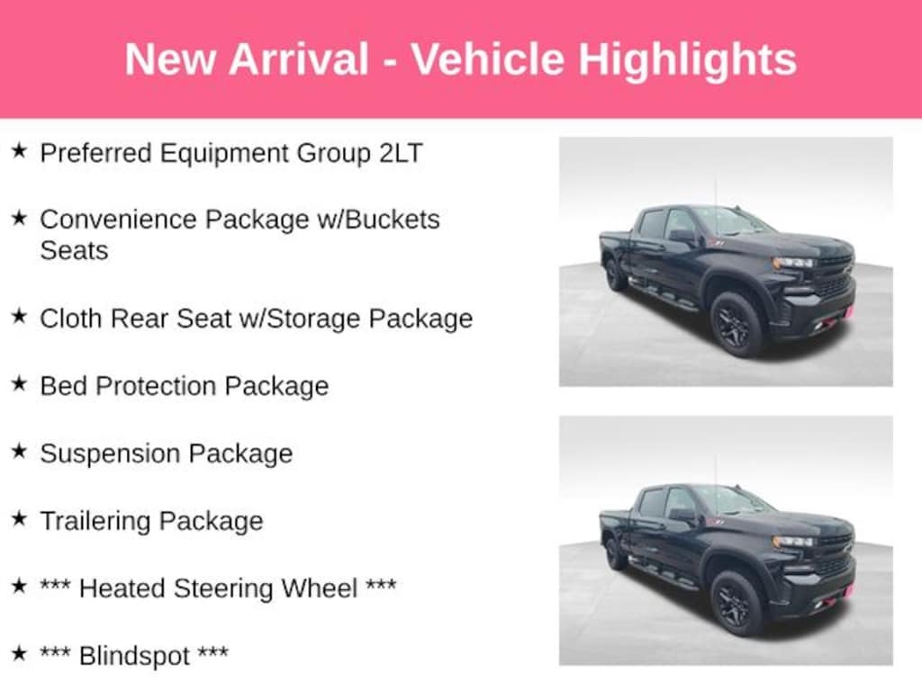 Coming Soon! LT TRAIL BOSS PREFERRED *** Z71 Off-Road equipment with 2" lift ***, Trailering Package *** Heated Steering Wheel *** Blindspot *** Android Auto and Apple Car Play *** Remote Start *** Tow Trailer Hitch *** Back Up Camera *** Heated Seats *** Bluetooth *** USB *** Inspected & Serviced by Master Technicians *** Recent Oil Change *** Vehicle Detailed *** Priced Below CARFAX and KBB Fair Market Price *** Nationwide Extended Warranties with Maintenance Available *** Rated #1 Dealership in Wisconsin 2022 2023 2024 by Dealer Rater *** Check out our Reviews! *** 10-Speed Automatic, 4WD, Jet Black w/Cloth Seat Trim, 10-Way Power Driver Seat w/Lumbar, 12-Volt Rear Auxiliary Power Outlet, 170 Amps Alternator, 2 USB Ports (First Row), 4-Way Manual Driver Seat Adjuster, 4.2" Diagonal Color Display Driver Info Center, 6-Speaker Audio System, All-Weather Floor Liner (LPO) (AAK), Auxiliary External Transmission Oil Cooler, Bed Protection Package, Bluetooth® For Phone, Chevytec Spray-On Black Bedliner, Cloth Rear Seat w/Storage Package, Color-Keyed Carpeting Floor Covering, Compass, Convenience Package w/Buckets Seats, Deep-Tinted Glass, Dual Exhaust w/Polished Outlets, Dual-Zone Automatic Climate Control, Electric Rear-Window Defogger, Electrical Lock Control Steering Column, Floor Mounted Center Console, Front Bucket Seats, Front LED Fog Lamps, Heated Driver & Front Outboard Passenger Seats, Heated Steering Wheel, Heavy-Duty Rear Locking Differential, High Capacity Air Filter, High Gloss Black Grille, High Gloss Black Mirror Caps, Hill Descent Control, Hitch Guidance, Keyless Open & Start, Leather Wrapped Steering Wheel, LED Cargo Area Lighting, LED Reflector Headlamps, Manual Tilt-Wheel Steering Column, Manual Tilt/Telescoping Steering Column, OnStar & Chevrolet Connected Services Capable, Performance Red Recovery Hooks, Power Door Locks, Power Front Windows w/Driver Express Up/Down, Power Front Windows w/Passenger Express Down, Power Rear Windows w/Express Down, Preferred Equipment Group 2LT, Rear 60/40 Folding Bench Seat (Folds Up), Rear Dual USB Charging-Only Ports, Rear Vision Camera, Rear Wheelhouse Liners, Remote Vehicle Starter System, Single-Zone Manual/Semi-Automatic Air Conditioning, Steering Wheel Audio Controls, Steering Wheel Mounted Electronic Cruise Control, Suspension Package, Theft Deterrent System (Unauthorized Entry), Trailering Package.