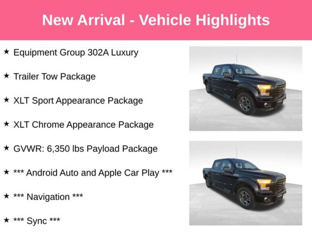 Coming Soon! * Over $9k in Options, XLT Sport *** Trailer Tow Package *** 302A Luxury *** 4WD *** Android Auto and Apple Car Play *** Navigation *** Sync *** Remote Start *** Tow Trailer Hitch *** Back Up Camera *** Heated Seats *** Power Rear Gate *** Bluetooth *** USB *** Inspected & Serviced by Master Technicians *** Recent Oil Change *** Vehicle Detailed *** Priced Below CARFAX and KBB Fair Market Price *** Nationwide Extended Warranties with Maintenance Available *** Rated #1 Dealership in Wisconsin 2022 2023 2024 by Dealer Rater *** Check out our Reviews! *** Over $9k in Options, , 4WD, 10-Way Power Driver's & Passenger Seats, 110V/400W Outlet, ABS brakes, Accent-Color Step Bars, Auxiliary Transmission Oil Cooler, Black Billet Style Grille w/Body-Color Surround, Blacked Out Everything ***, Body-Color Door & Tailgate Handles, Body-Color Front & Rear Bumpers, Box Side Decal, Class IV Trailer Hitch Receiver, Cloth 40/20/40 Front Seat, Compass, Electronic Stability Control, Equipment Group 302A Luxury, Heated Front Seats, Illuminated entry, Leather-Wrapped Steering Wheel, LED Box Lighting, Low tire pressure warning, Power Glass Heated Sideview Mirrors, Power-Adjustable Pedals, Power-Sliding Rear Window, Pro Trailer Backup Assist, Radio: Single-CD w/SiriusXM Satellite, Rear Under-Seat Storage, Rear View Camera w/Dynamic Hitch Assist, Remote keyless entry, Remote Start System, Reverse Sensing System, Single-Tip Chrome Exhaust, SYNC 3, Traction control, Trailer Tow Package, Upgraded Front Stabilizer Bar, Wheels: 18" 6-Spoke Machined-Aluminum, XLT Chrome Appearance Package, XLT Sport Appearance Package.