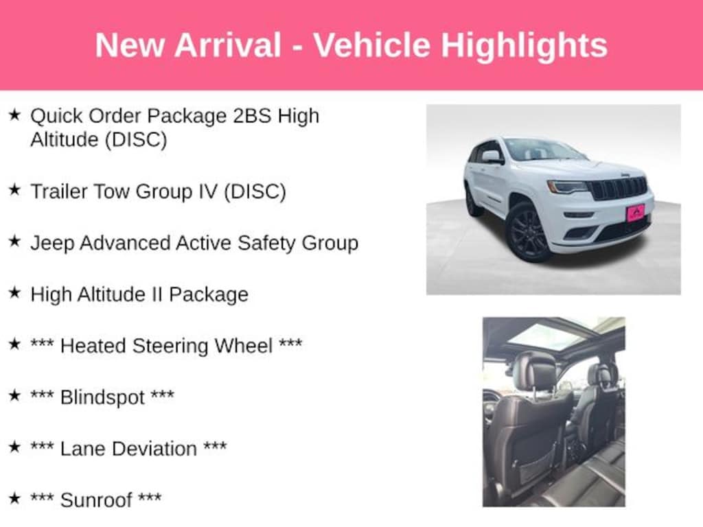 Over $5k in Options *** 2 BS High Altitude *** Heated Steering Wheel *** Blindspot *** Lane Deviation *** Sunroof *** Adaptive Cruise *** Android Auto and Apple Car Play *** New Brakes *** Navigation *** Remote Start *** Tow Trailer Hitch *** Back Up Camera *** Heated Leather Seats *** Heated and Ventilated Leather Seats *** Power Rear Gate *** Bluetooth *** USB *** Inspected & Serviced by Master Technicians *** Recent Oil Change *** Vehicle Detailed *** Priced Below CARFAX and KBB Fair Market Price *** Nationwide Extended Warranties with Maintenance Available *** Rated #1 Dealership in Wisconsin 2022 2023 2024 by Dealer Rater *** Check out our Reviews! *** Over $5k in Options *** 4WD, Anodized/Light Black Chrome Interior Accents, Black Roof Molding, Black Wood Instrument Panel & Door Spears, Blind Spot & Cross Path Detection, Body Color Door Handles, Body Color Exterior Mirrors, Body Color Fascias w/Granite Accents, Body Color Sill Extension, Bright Pedals, Dark Day Light Opening Moldings, Dark Headlamp Bezel Finish, Dark Lens Taillamps, Dual Dark Chrome Exhaust Tip, Granite Crystal Exterior Accents, Granite Crystal Exterior Badging, Granite Crystal/Black Grille, Headlamp Washer, High Altitude II Package, Jeep Advanced Active Safety Group, Leather Wrapped Steering Wheel, Nappa Leather Trimmed Bucket Seats (DISC), Navigation System, Premium Accent Claddings, Premium LED Fog Lamps, Quick Order Package 2BS High Altitude (DISC), Trailer Tow Group IV (DISC), Wheels: 20" x 8.0" Granite Crystal Aluminum (DISC).