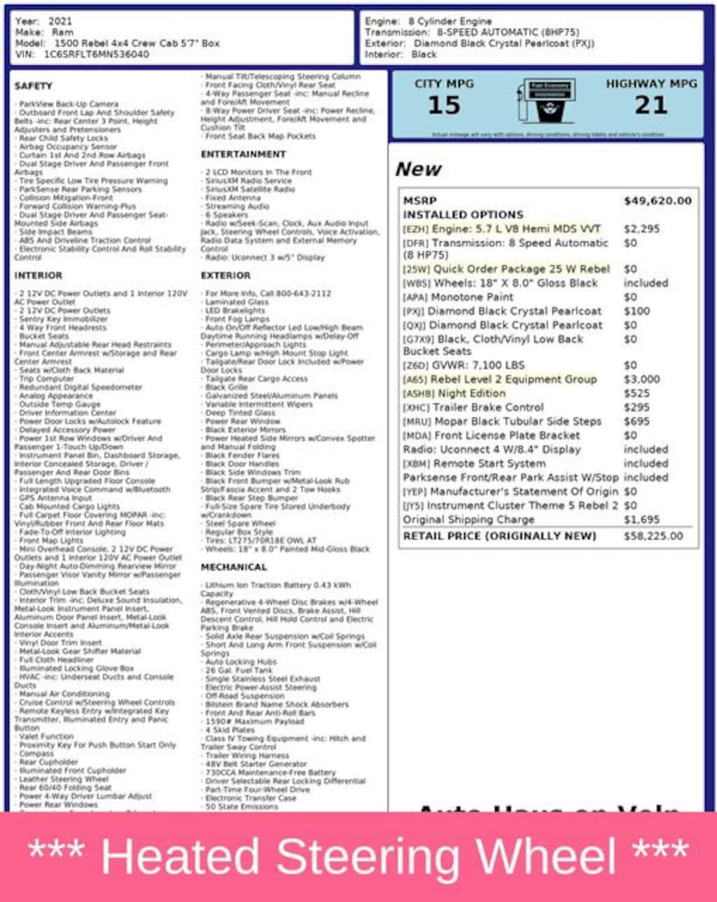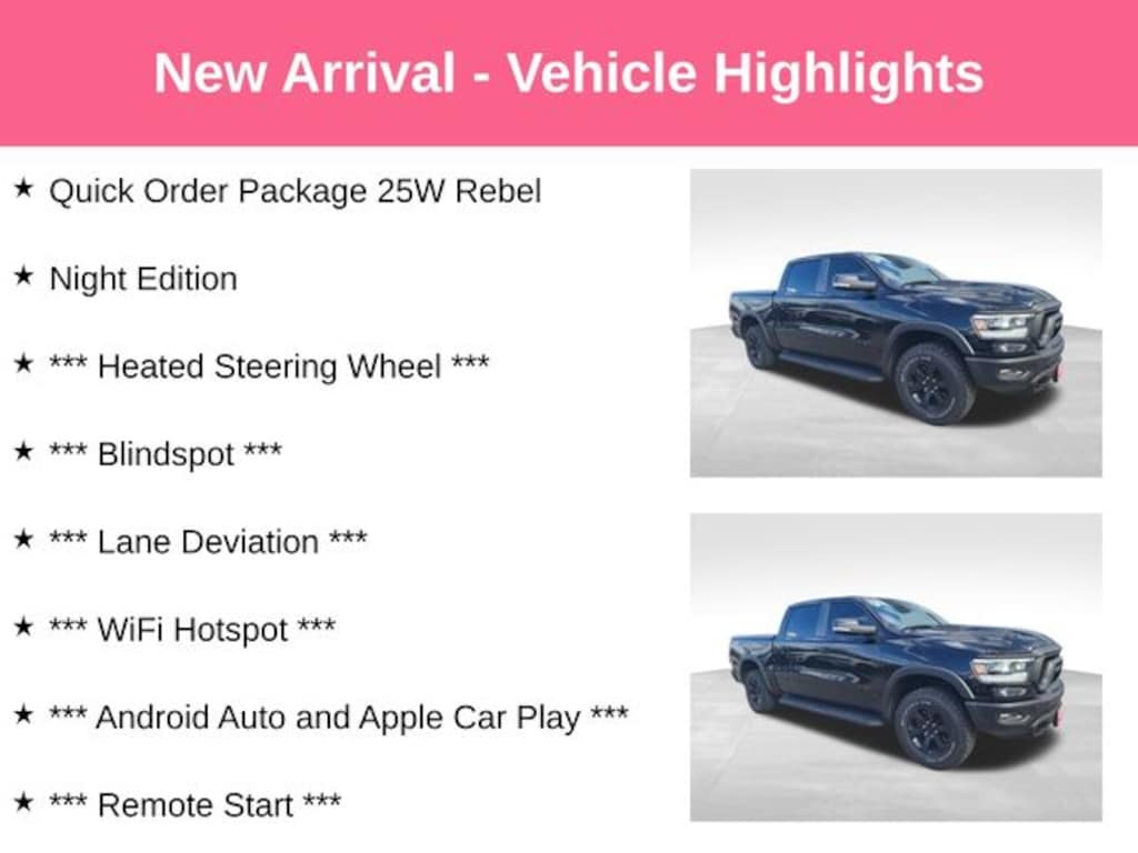 Coming Soon! Over $8k in Options *** Night Edition *** 25W Rebel *** Heated Steering Wheel *** Blindspot *** Lane Deviation *** WiFi Hotspot *** Android Auto and Apple Car Play *** Remote Start *** Tow Trailer Hitch *** Back Up Camera *** Heated Seats *** Bluetooth *** USB *** Inspected & Serviced by Master Technicians *** Recent Oil Change *** Vehicle Detailed *** Priced Below CARFAX and KBB Fair Market Price *** Nationwide Extended Warranties with Maintenance Available *** Rated #1 Dealership in Wisconsin 2022 2023 2024 by Dealer Rater *** Check out our Reviews! *** Over $8k in Options, Night Edition *** 25W Rebel *** Black Front Bumper w/Black Plate, Grille Moustache Black Outline Texture 3, Night Edition, Quick Order Package 25W Rebel, RAM Grille Badge - Black, Wheels: 18" x 8.0" Gloss Black.